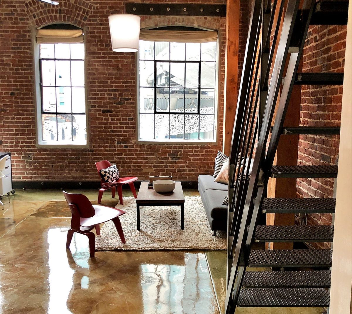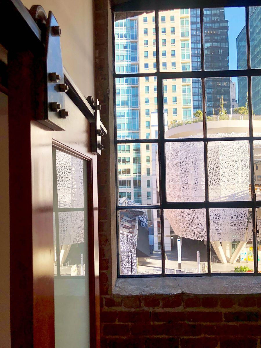 Stand-out features include a beautiful entry lobby with a visible steel-braced frame situated at the large front window. Reds and grays dominate the color scheme, complemented by plentiful mature plantings. A bubbling water feature originates at the top of the staircase, streaming water along a steel channel in the guardrail and emptying it into waiting scuppers below. Interiors offer views of Salesforce Park, exposed 15′ timber columns, brick walls, and sliding hardwood door panels with sandblasted glass.