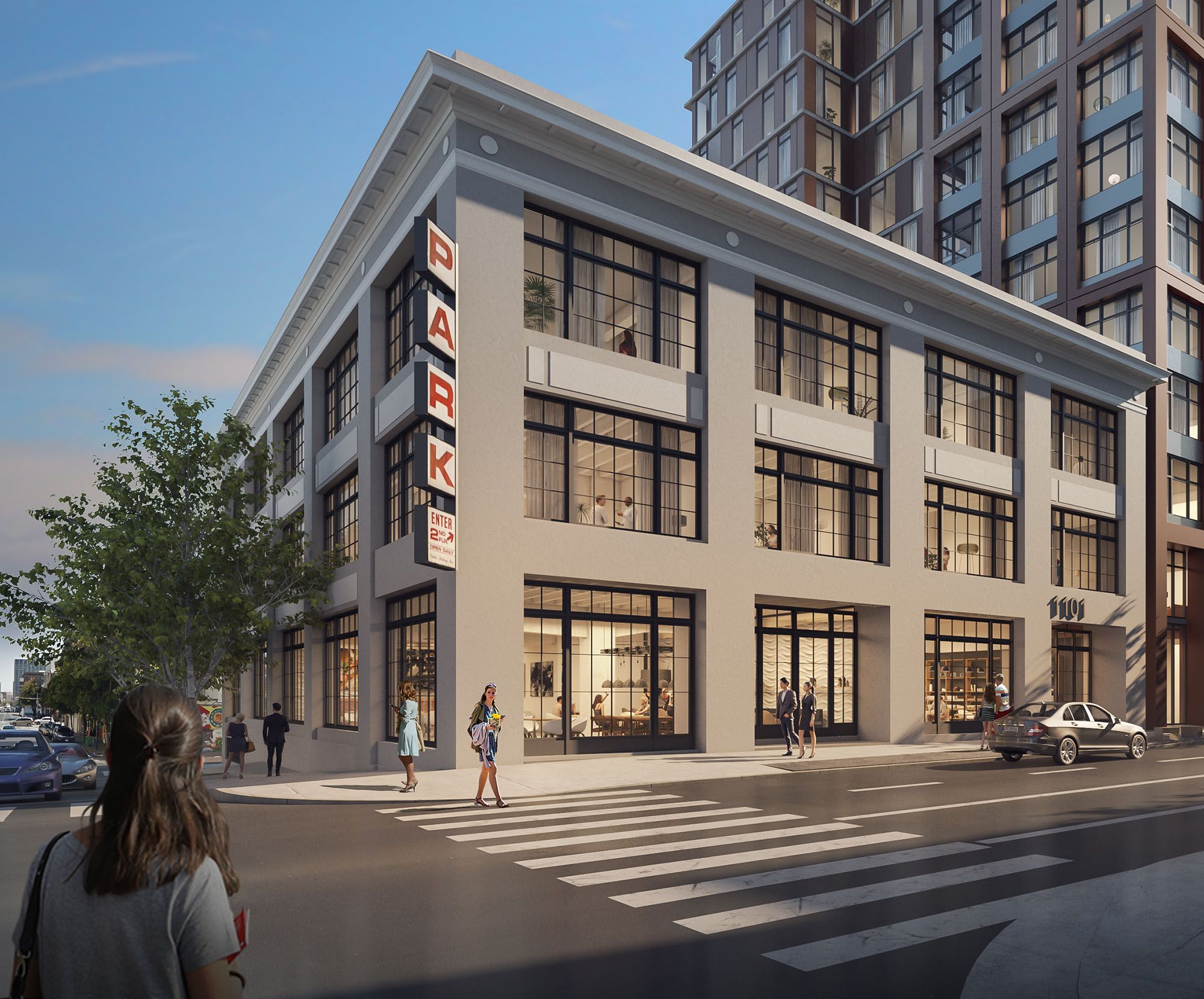 At the corner of Sutter and Larkin, the three-level concrete auto-repair building—built in 1920 and designated an A-status Historic Resource—will be renovated into a mixed-use residential structure. The ground floor will feature commercial space, a residential lobby, and an interior connection with the adjacent new residential high-rise. The second and third levels of the historic building will accommodate 16 residential units, and the structure will undergo improvements to the partially below-grade garage to provide building parking.