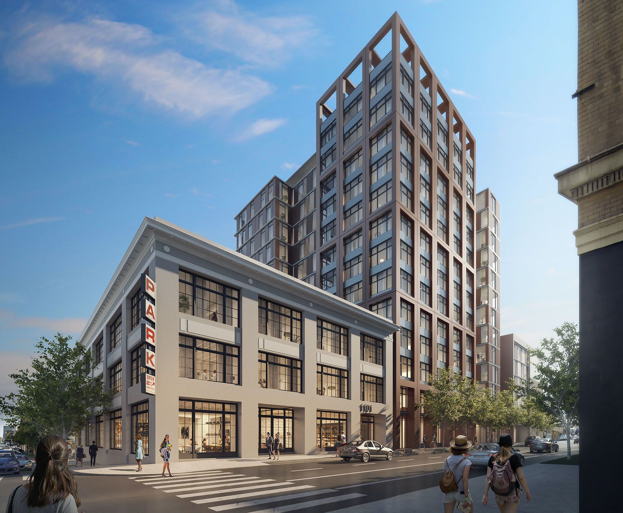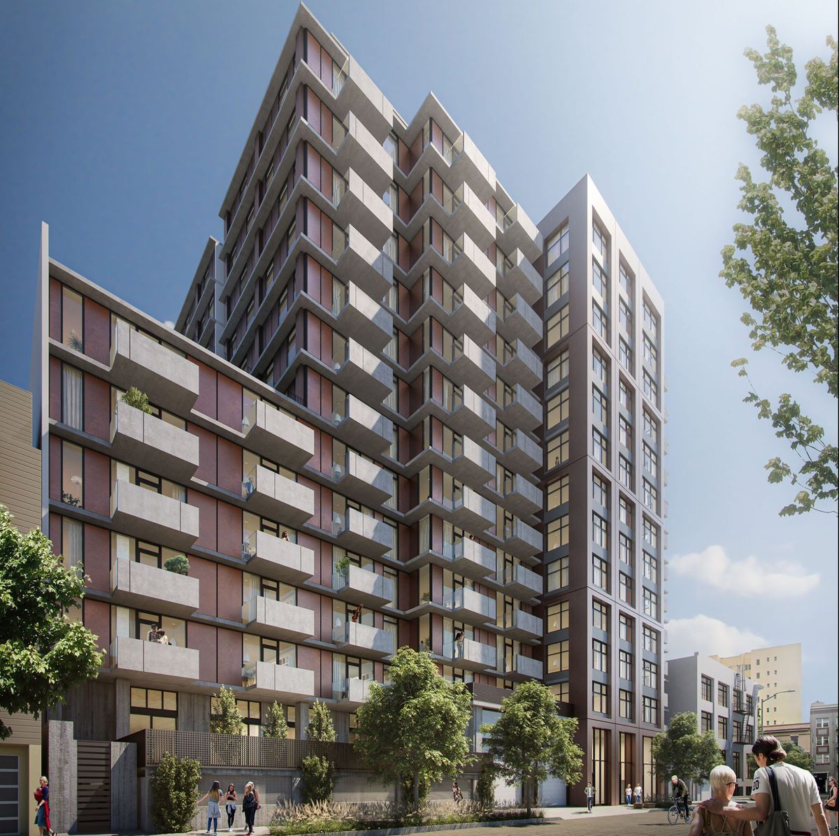 The 14-story, 150-foot tower will offer 185 rental apartments over an active, pedestrian-friendly commercial ground floor. Oriented toward Sutter Street, the dynamic street level incorporates a mix of uses, including the primary residential lobby, common amenities for residents, commercial and retail spaces, and a child care center.